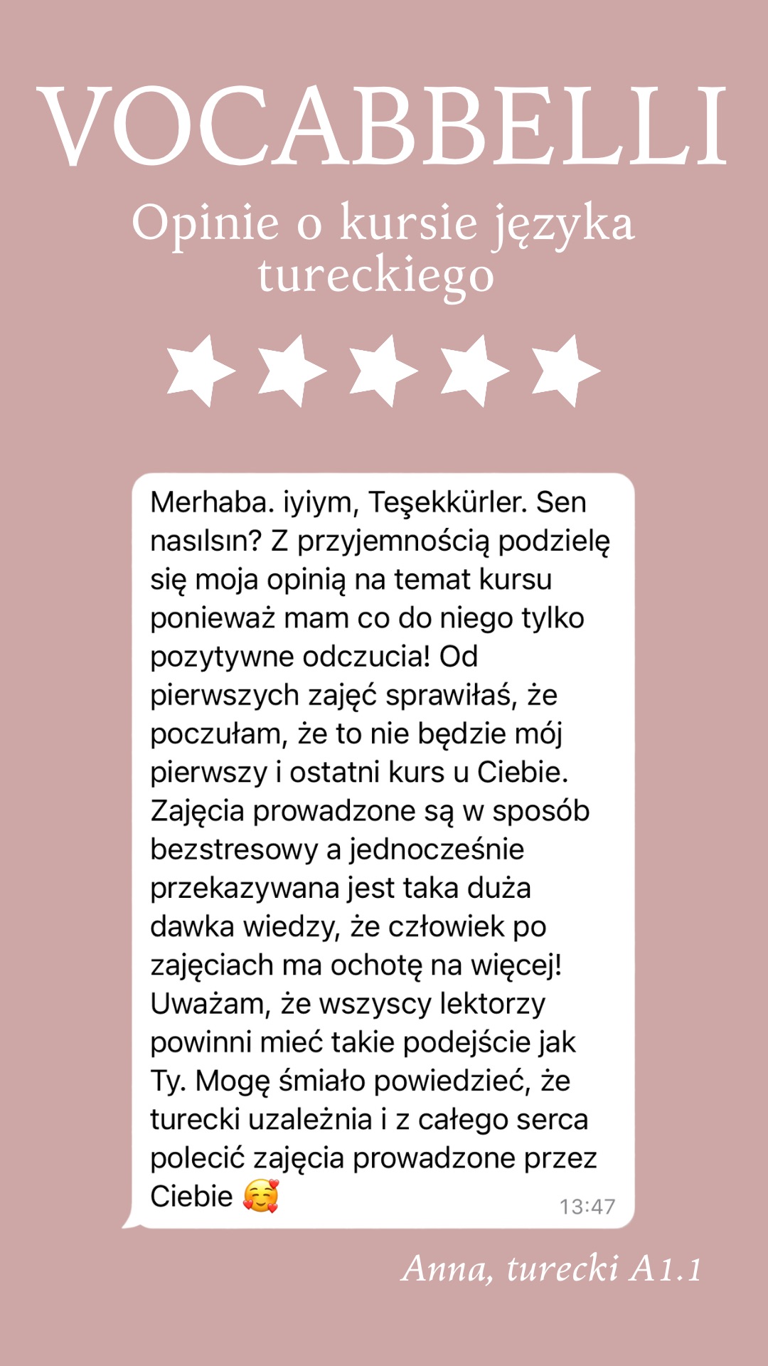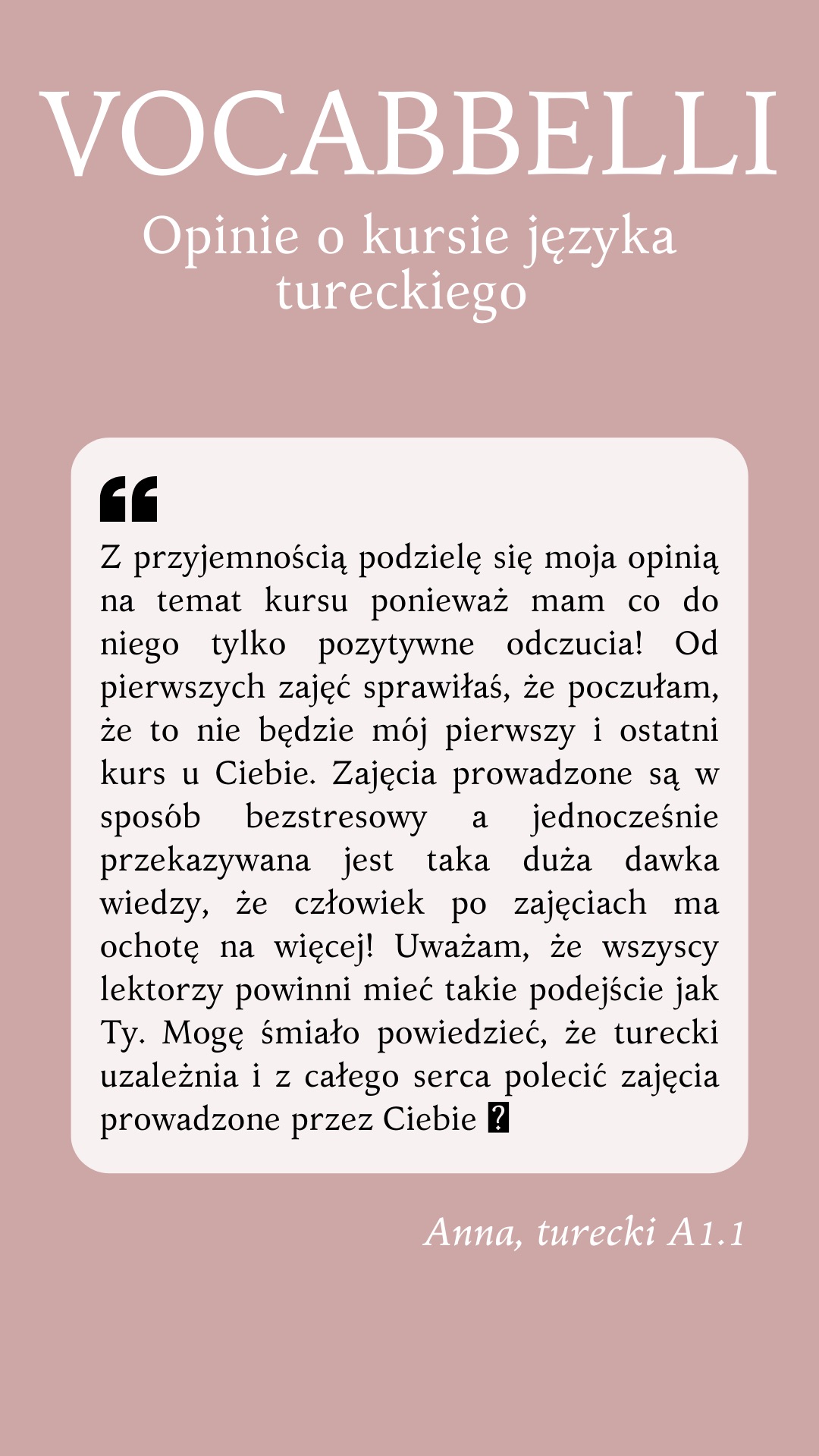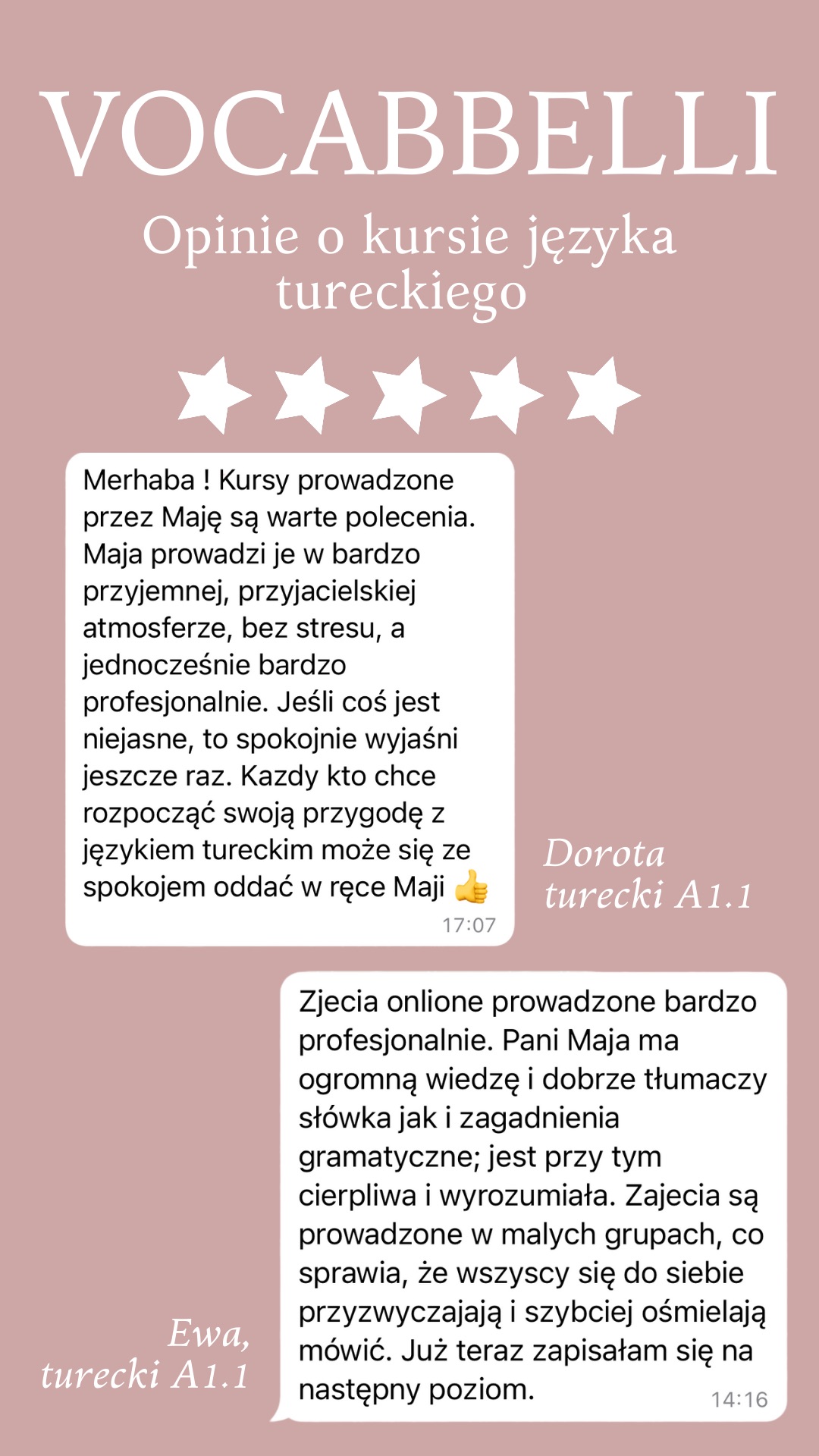 To niepowtarzalna okazja, aby rozpocząć swoją przygodę z nauką języka tureckiego w rozsądnej cenie. Kurs kosztuje jedynie 280zł miesięcznie! Poniżej możecie zapoznać się z opiniami moich dotychczasowych kursantek.