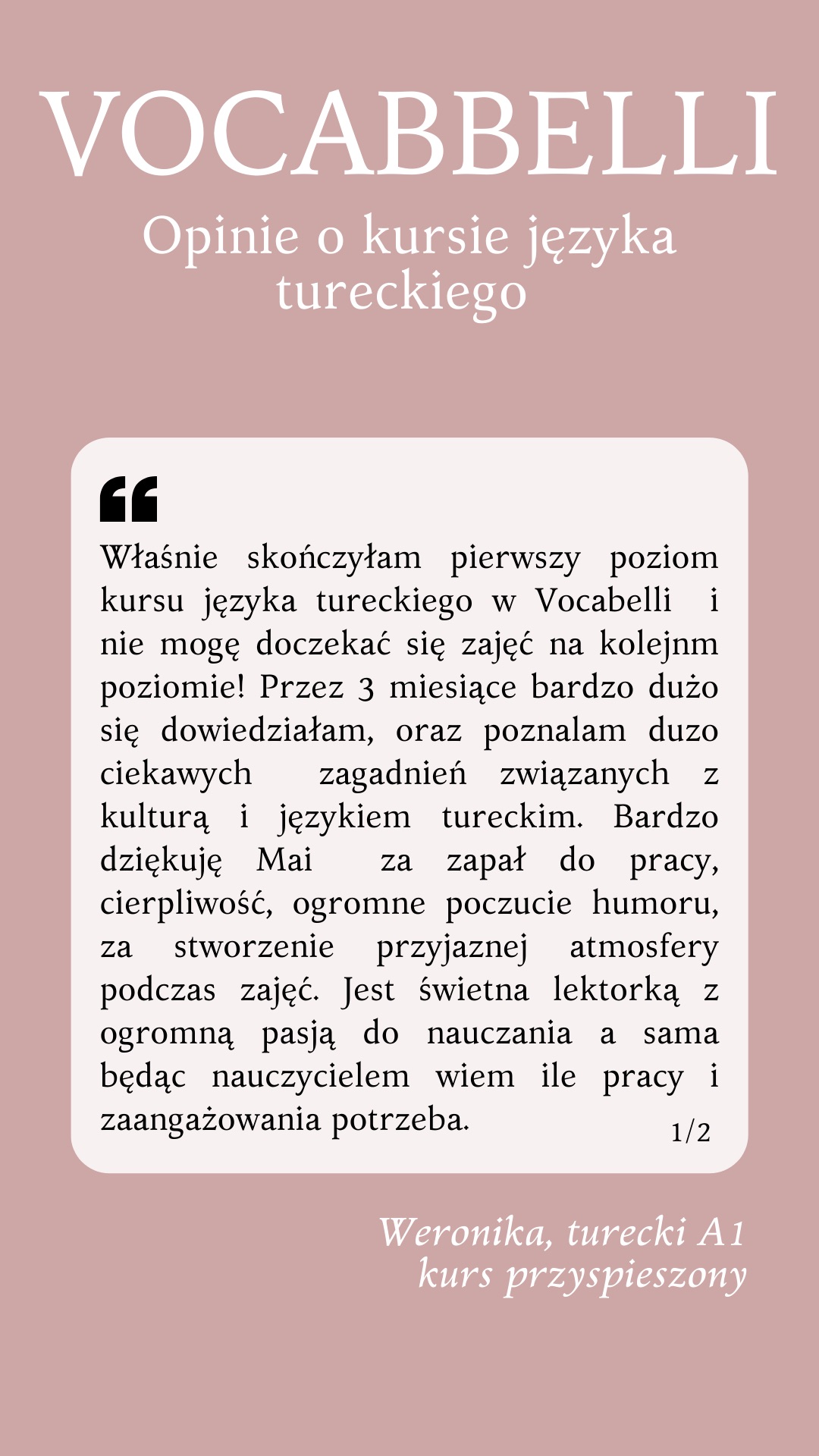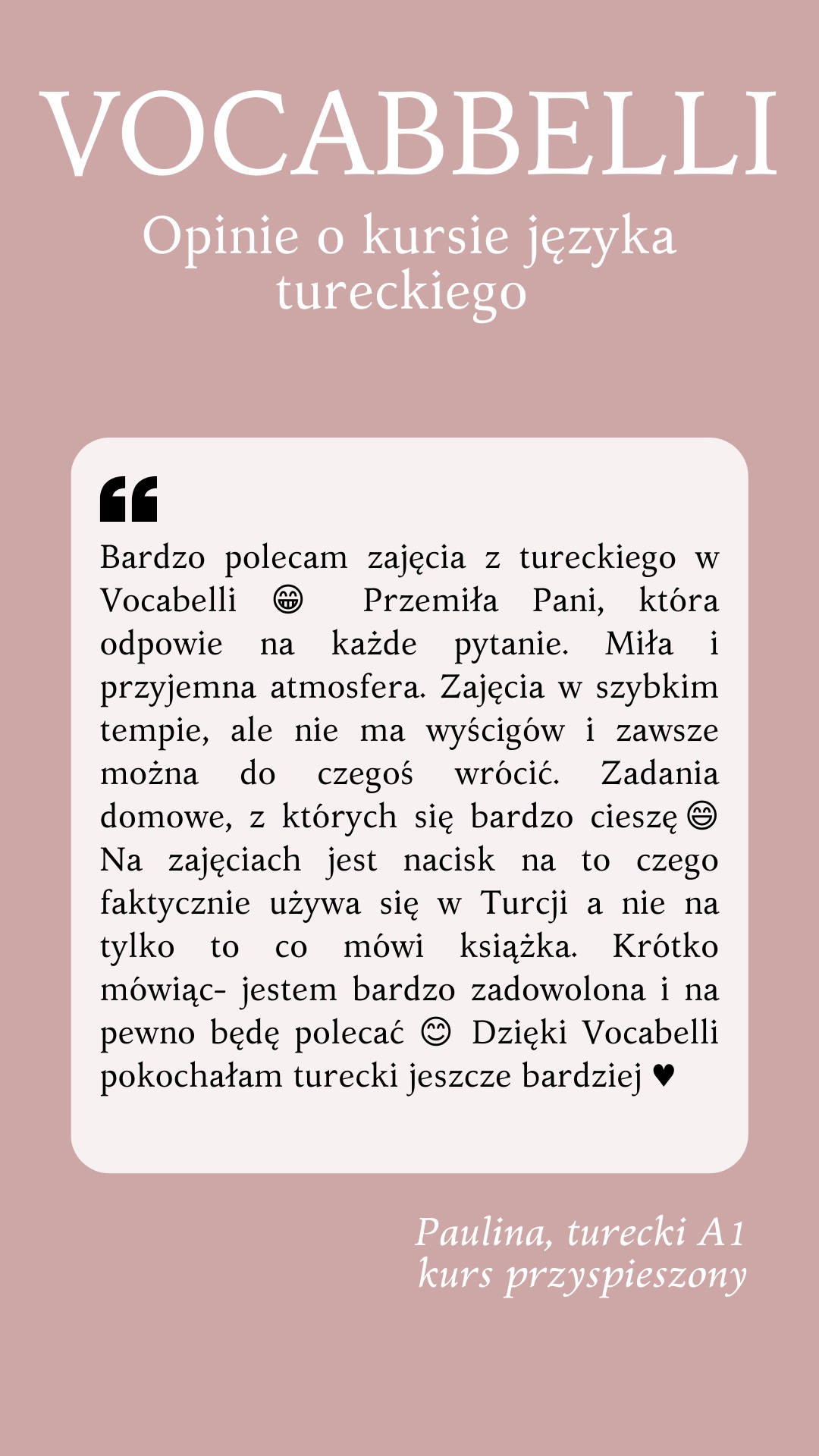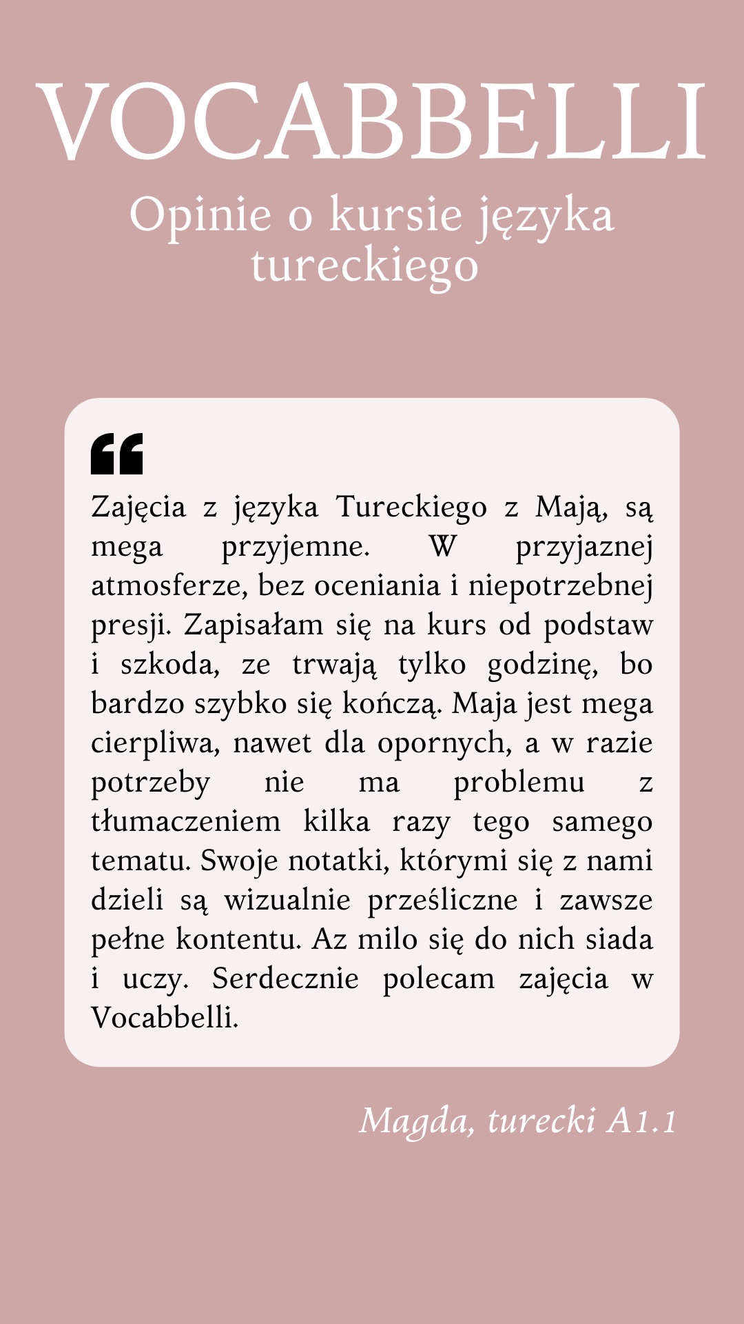 To niepowtarzalna okazja, aby rozpocząć swoją przygodę z nauką języka tureckiego w rozsądnej cenie. Kurs kosztuje jedynie 280zł miesięcznie! Poniżej możecie zapoznać się z opiniami moich dotychczasowych kursantek.
